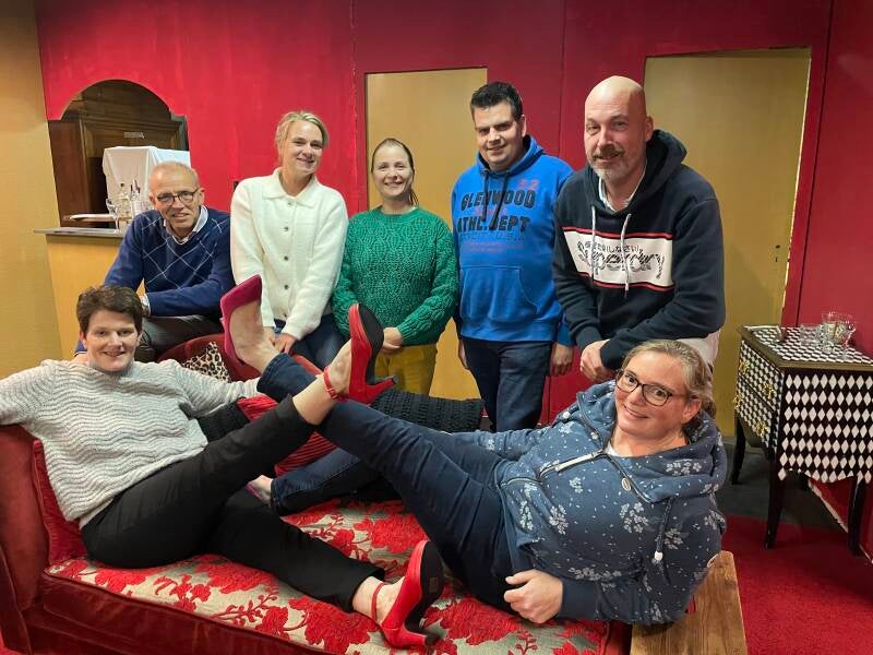 Het is een hele leuke, gezellige, diverse groep. Iedereen heeft een rol die hij of zij goed kan uitvoeren en bij hem of haar past. Ook voor de repetities en na is het erg gezellig en wat ik ook leuk vind is dat iedereen erg enthousiast is voor dit stuk, omdat het erg anders is als onze voorgaande stukken. Hierdoor is iedereen ook al meteen opzoek gegaan naar spullen voor het decor en kleding die ze aan willen trekken. Dit delen we dan met elkaar, zo doen we het ook echt samen. Ik zal ze aan jullie voorstellen: